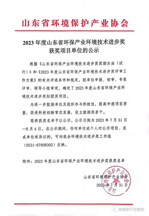 | 山東省環(huán)保產(chǎn)業(yè)環(huán)境技術進步獎 | 省級 | 山東省環(huán)境保護產(chǎn)業(yè)協(xié)會 |