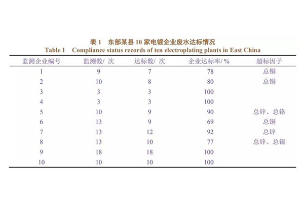 根據(jù)在我國東部某縣調(diào)研獲得的當(dāng)?shù)仉婂兤髽I(yè)廢水達(dá)標(biāo)排放情況進(jìn)行分析(見表1),電鍍企業(yè)的超標(biāo)因子主要集中在總銅、總鋅、總鉻和總鎳。