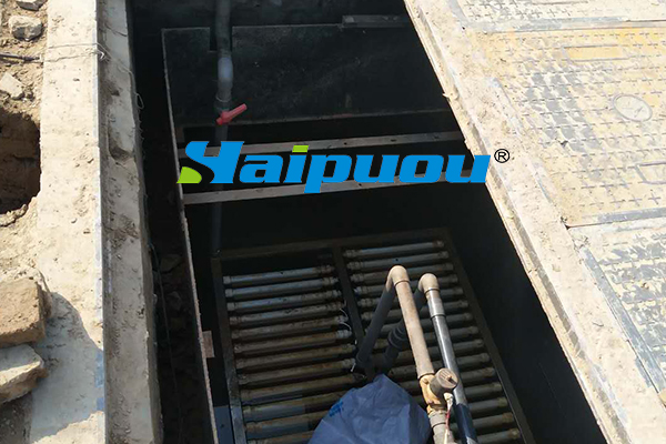 1、曝氣裝置可以固定在池底(需要做膜組件承托架和膜組件滑入導(dǎo)軌),也可以跟膜組件做在一起,各有優(yōu)劣,曝氣管的位置要做精心考慮,采用DN20穿孔管,每個(gè)膜片間隙對應(yīng)一路穿孔管,穿孔大小Φ2.0mm,穿孔間距100mm,相鄰兩路管穿孔位置交錯(cuò)穿插,孔口做單排垂直向上。