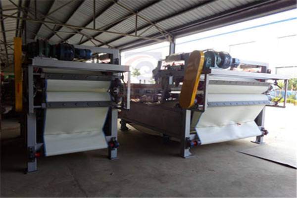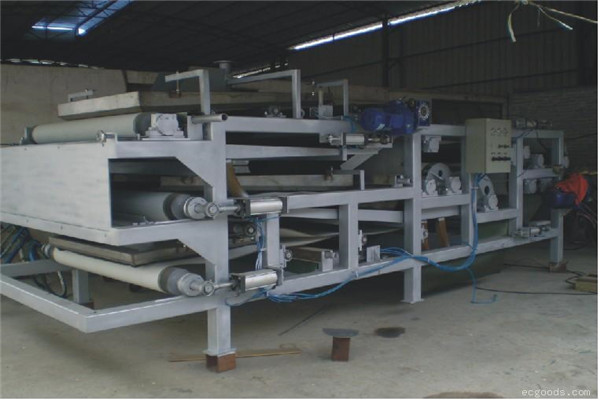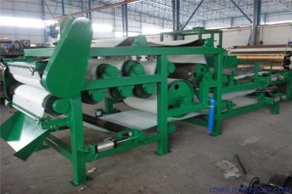 帶式壓濾機,即通過皮帶擠壓,兩層濾布夾住泥漿,然后通過設(shè)備的濃縮段過濾水,再通過設(shè)備“S”區(qū)的滾筒對泥漿進(jìn)行壓榨脫水。