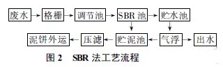 食物廢水包括酒精、啤酒、味精、淀粉、乳糖、檸檬酸、蔬菜加工和飲料加工等過程中產生的廢水,這些廢水水質普遍較差,處理難度大,投資和運行費用高。并通過大量的工程實踐逐步驗證了SBR法的可行性及優(yōu)越性,SBR法用于食品廢水的處理取得了滿意的效果。圖2列出了工藝流程。